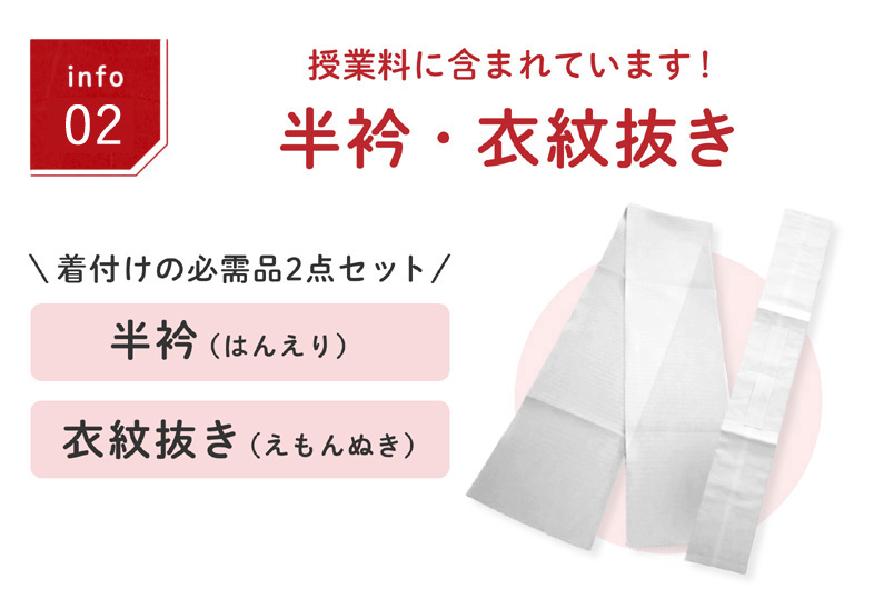 半襟(はんえり)・えもんぬきの2点セットをご用意いたします。授業料に含まれています。初回の授業でお渡し致します。